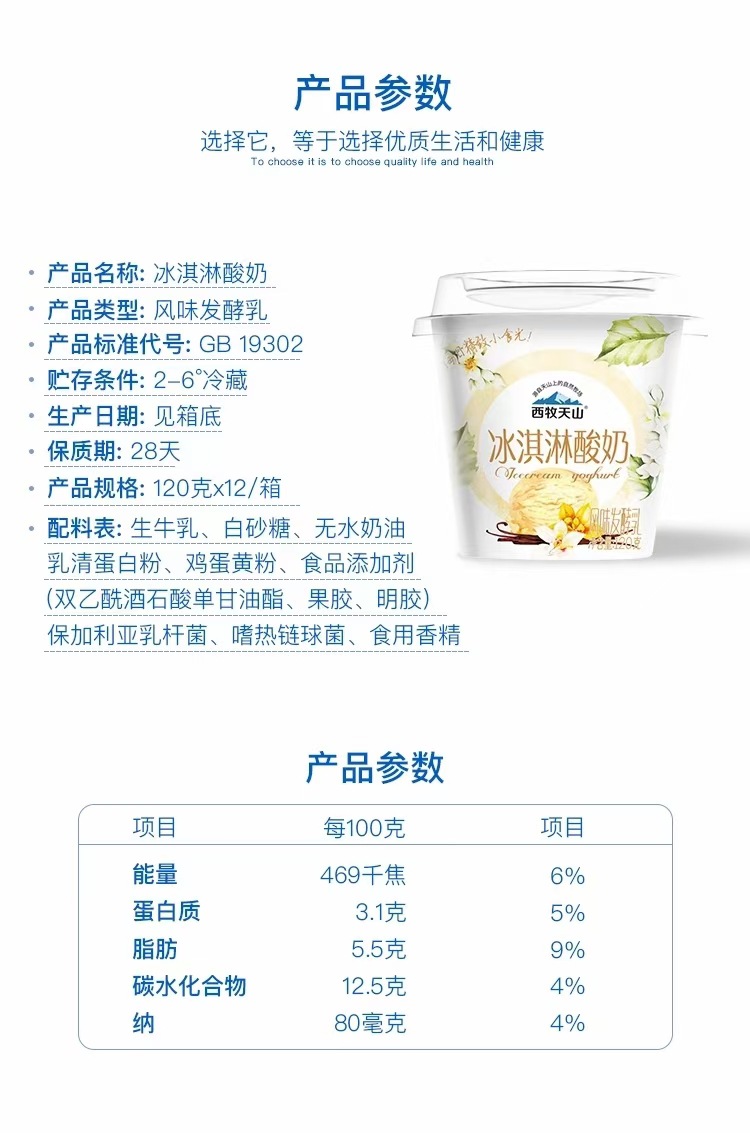 【名称】西牧天山冰淇淋酸奶 【规格】14*120克/箱 【发货地】安徽合肥 【快递】圆通、极兔、中通,不接受指定快递 【不发货地区】新疆、西藏、青海、甘肃、宁夏、海南、内蒙 【售后】签收24小时内,发现有破损跟快递单号一起拍照,按实际破损数量比例理赔,牛奶属于生鲜产品,快递途中破损难免,不接受拒收、退改签,介意慎拍!