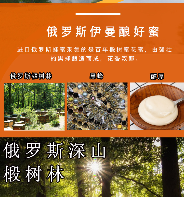俄罗斯蜂蜜原装进口国家馆纯正天然结晶瓶装椴树蜜500g食品