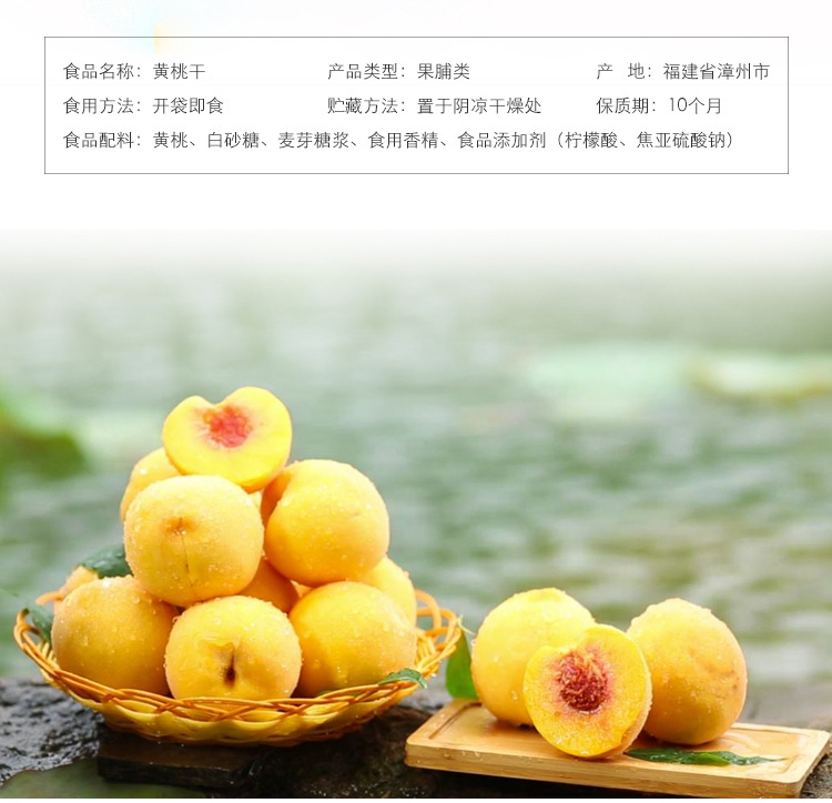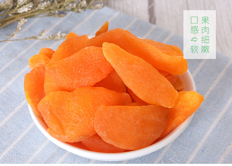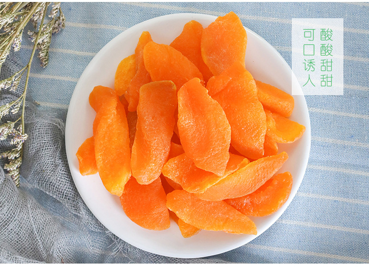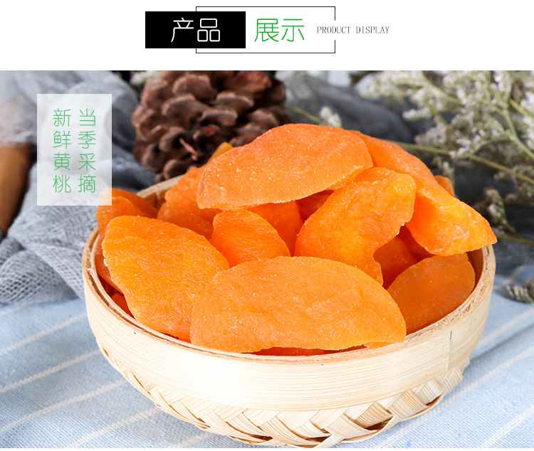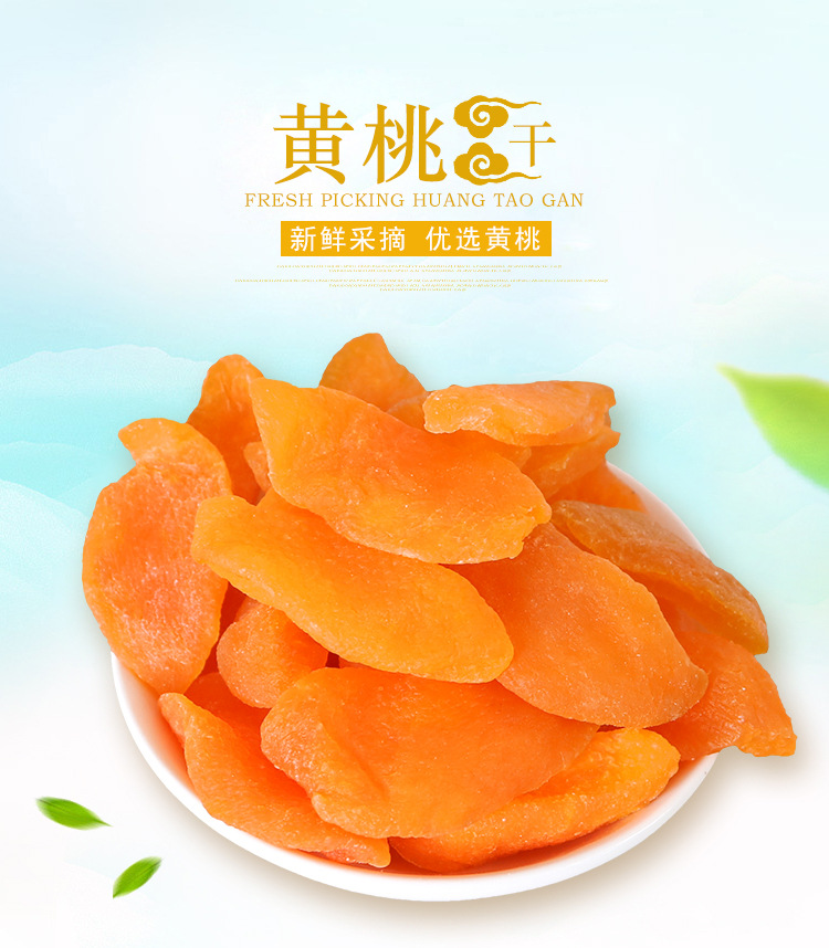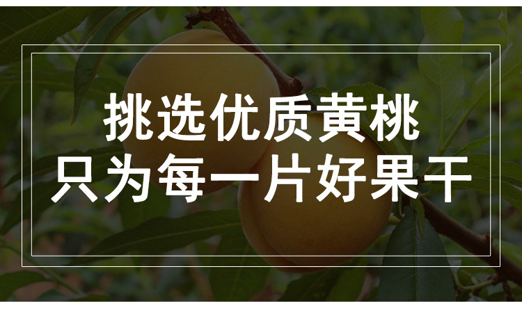 黄桃干采用是鲜果制作,色泽自然,口感好。新鲜黄桃采摘后清洗、浸糖、烘干,少了化工原料的浸泡,黄桃本身的味道得以保留,淡淡的黄桃香气,少甜、微酸,自然香甜,Q感十足。