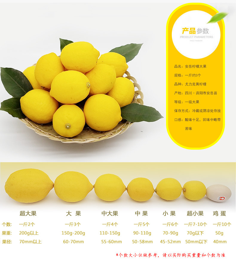 第①:柠檬在划分规格的时候已经经过严格挑选(主要挑选参数包括柠檬的等级,大小等),但不排除个别柠檬有规格不符以及有瑕疵(果面有少量黑点,乳包,刮痕,撞伤,漏青等),这些情况无论是人工筛选还是机器分选都不能完全避免。柠檬属于生鲜类目,无法进行二次销售,不支持拒收货,退换货。