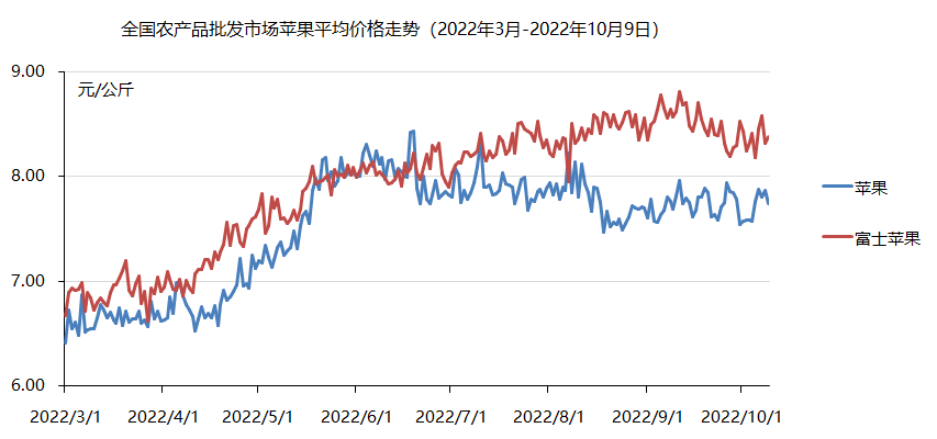 好在,2022年,苹果行情持续向好。据农业农村部数据显示,2022年3月至10月,苹果市场批发价从每斤3元左右上涨至4元,行情有所回升。