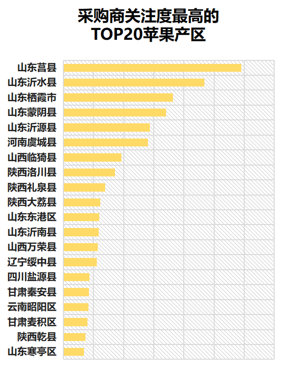 据一亩田平台大数据显示,在采购商关注度最高的TOP20产区中,山东莒县和沂水区的用户积极性较高,也获得了采购商较高的关注度。山东栖霞、山东沂源、河南虞城、山西临猗以及陕西洛川等地,采购商关注度也比较高,排名相对靠前,这与这些产区在市场上品牌知名度较高有一定的关系。