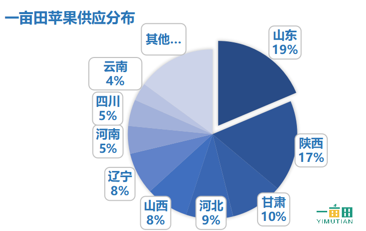 基于用户在一亩田平台中发布的供应信息进行统计,我们可以看出,在一亩田平台中的苹果分布情况与苹果产量分布情况相类似,但略有差别,主要表现在:陕西和山东两个苹果最主要产区,同样也是一亩田平台中供应占比最大的省份,但山东要略高于陕西。