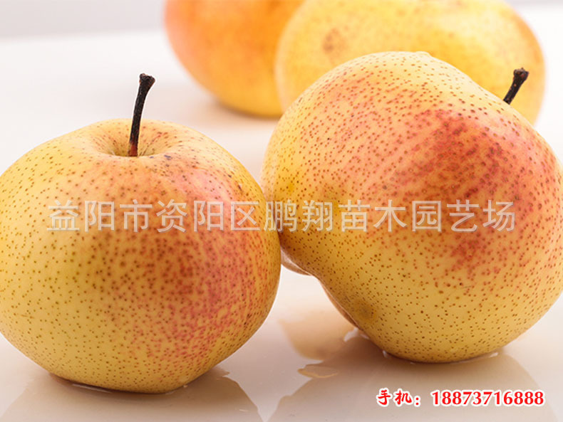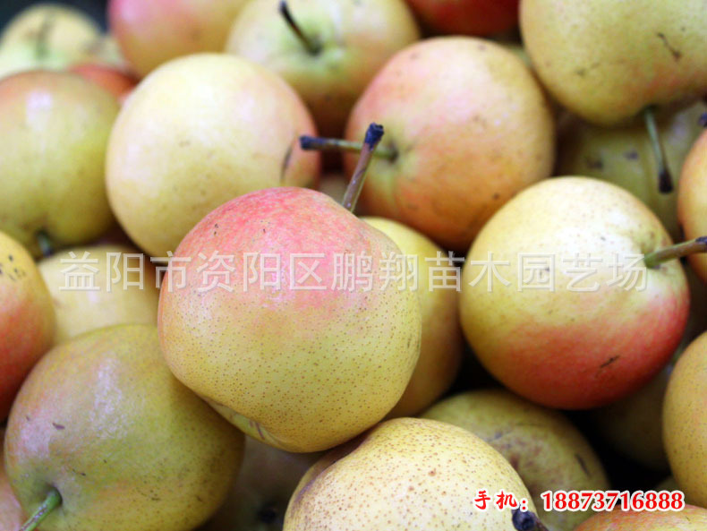 苹果梨系北方地区果品。果实呈不规整扁圆形,形态似苹果,平均单果重230克,大者可达600克;果皮绿黄色,阳面有红晕;果点较小;果心小;果肉白色,细脆,石细胞少,味酸甜,汁多;含可溶性固形物12.8%,可溶性糖8.99%,品质上等。果实耐贮藏,可贮至翌年5月。树势及萌芽力强,成枝力中等。定植后4~5年开始结果。成年结果树以短果枝为主,短果枝占71.0%,丰产性强。果实9月下旬至10月上旬成熟。该品种适应性及抗寒力强,能耐-30℃低温,抗旱、抗黑星病。